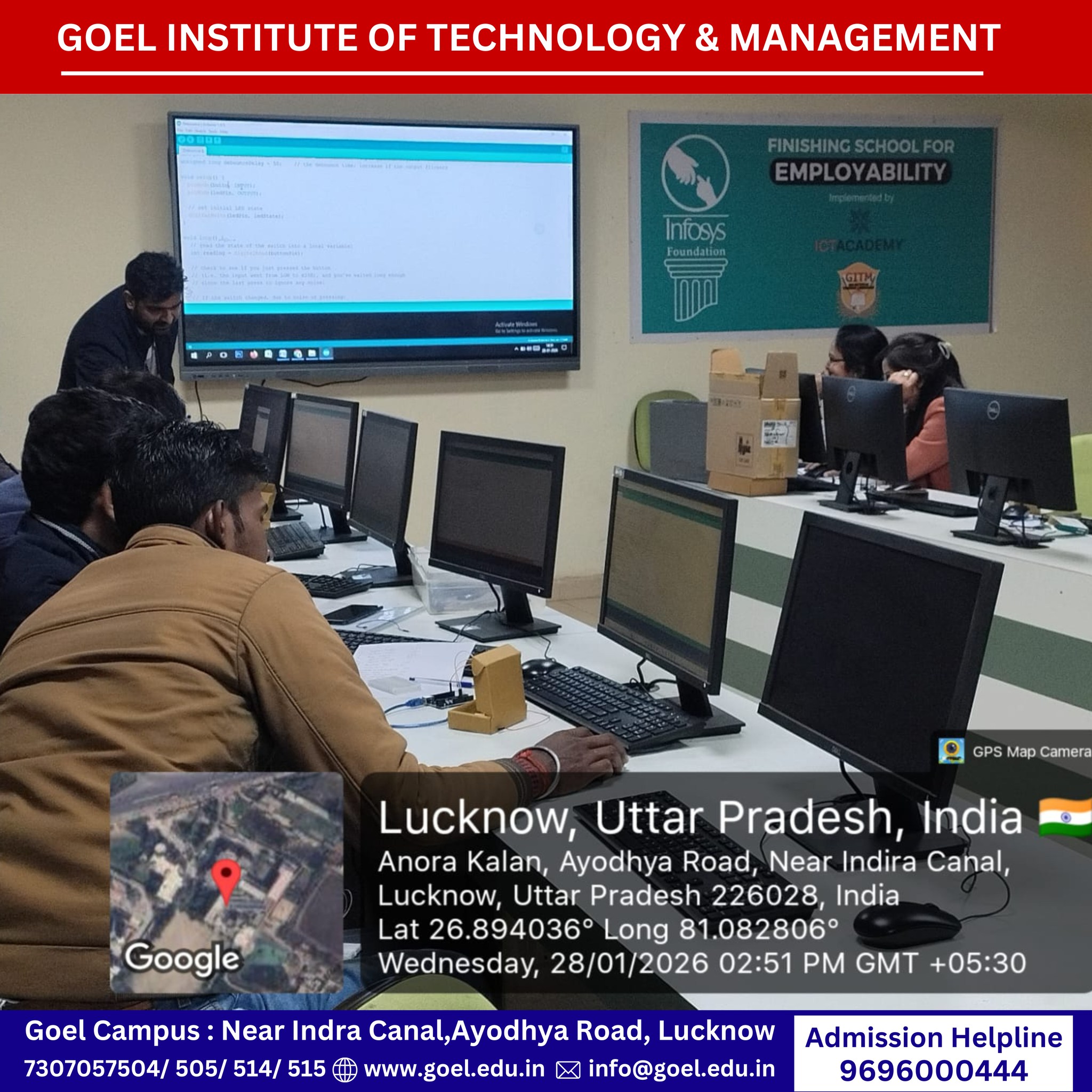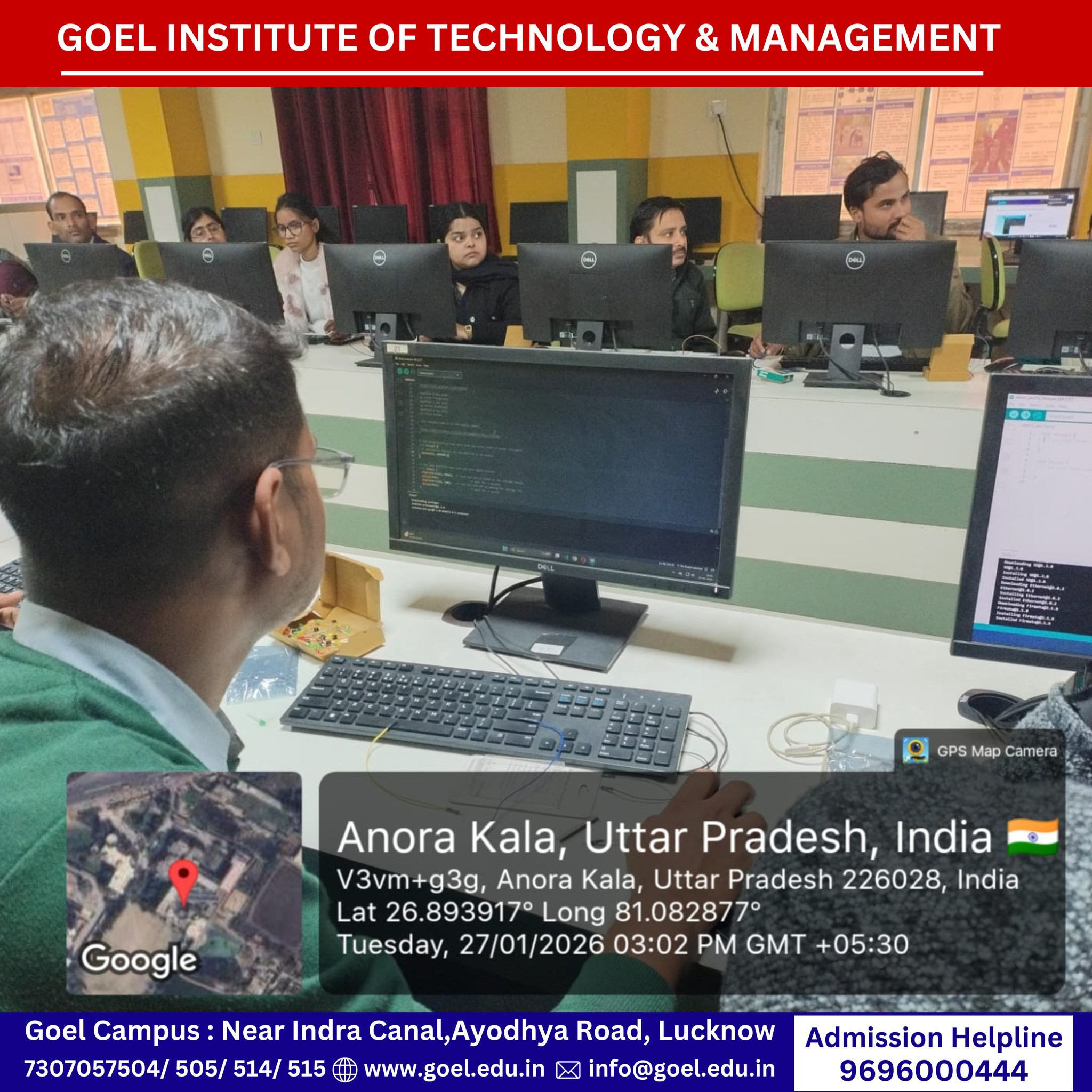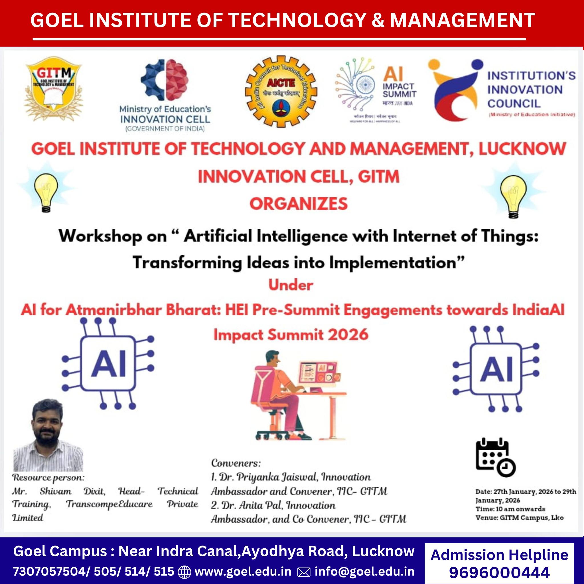 The Innovation Cell, Goel Institute of Technology and Management (GITM), Lucknow successfully organized a 3-day offline workshop on “Artificial Intelligence with Internet of Things: Transforming Ideas into Implementation” from 27–29 January 2026, under the theme “AI for Atmanirbhar Bharat: HEI Pre-Summit Engagements towards IndiaAI Impact Summit 2026.”